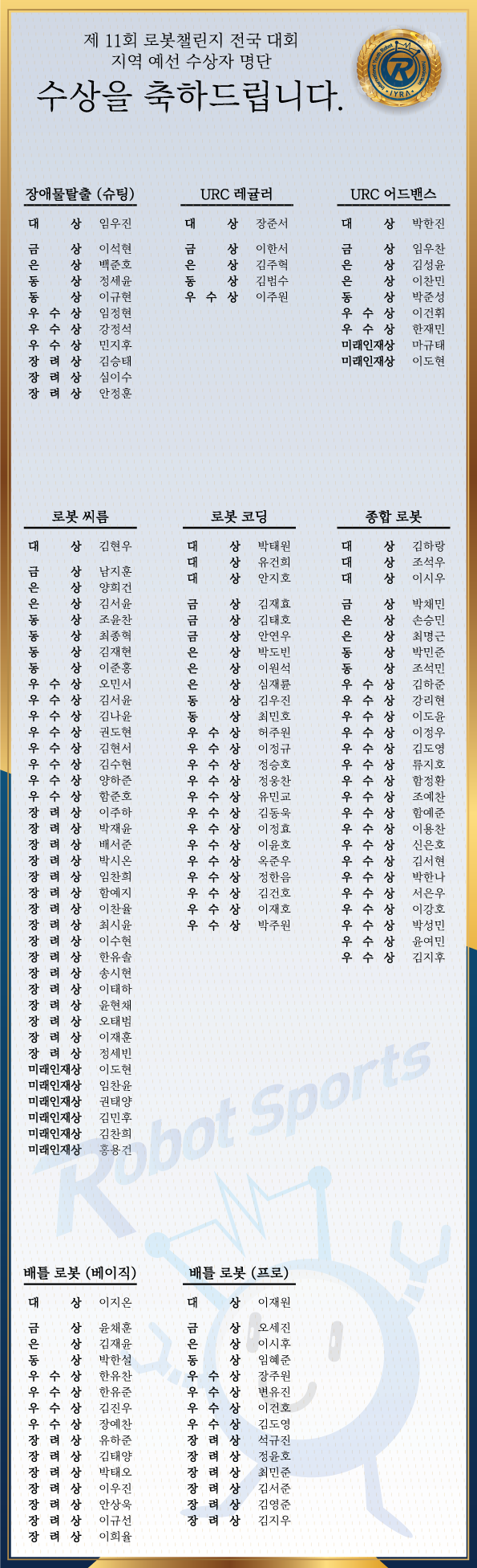 Á¦11ȸ ´ëÇѹα¹ û¼Ò³â ·Îº¿½ºÆ÷Ã÷ Àü±¹ ´ëȸ (¿µÁ¾) - ¼ö»óÀÚ ¸í´Ü
